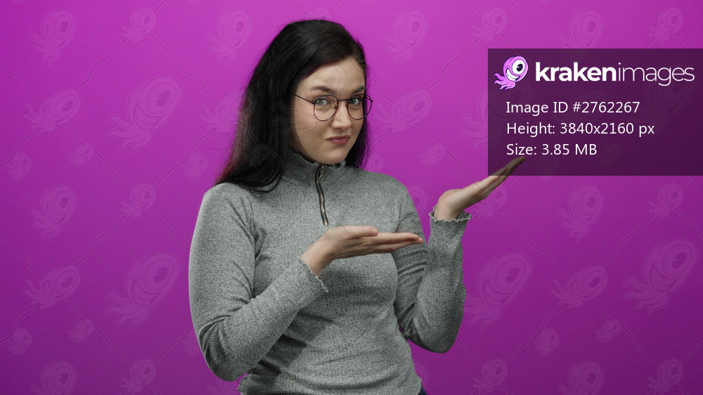 Woman with brown hair gestures confidently against a vibrant pink background wearing a gray sweater in various playful and expressive poses conveying emotion and curiosity. - Kraken Images