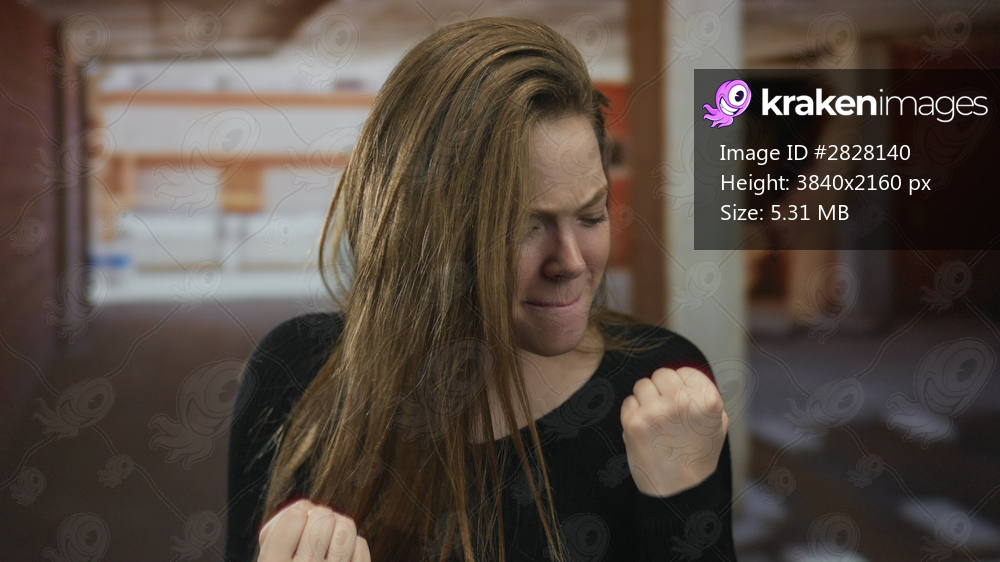 Woman with brown hair pumps fists and smiles broadly in building under construction; enthusiasm motivation determination.