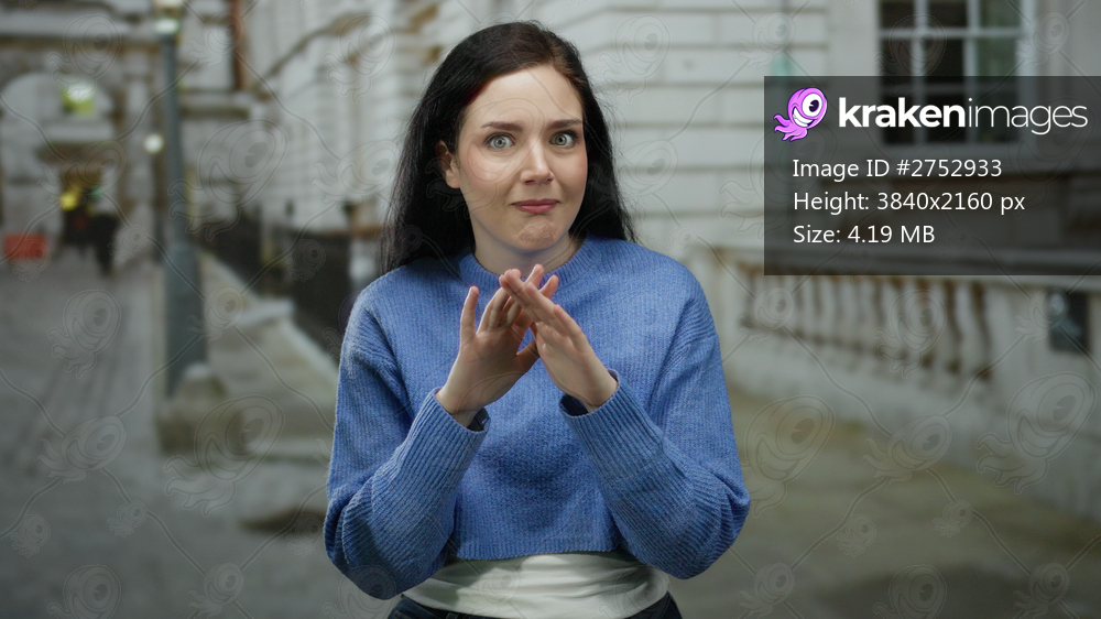 Woman brunette blue street outdoors expressions gesture confused urban young city buildings standing daytime curious