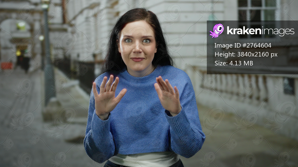 Woman brunette blue street outdoors expressions gesture confused urban young city buildings standing daytime curious