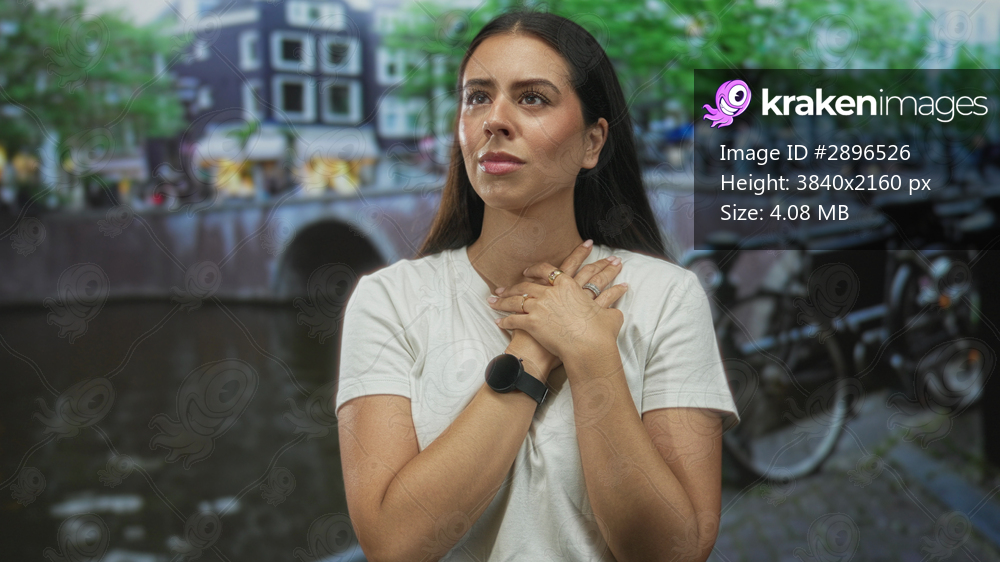 Woman brunette clasping hands on street beside amsterdam canal, wearing white t shirt and smartwatch, looking thoughtful; reflection hope serenity.