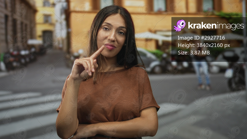 Woman brunette with finger to lips for silence in street crosswalk by scooters and building; silence.