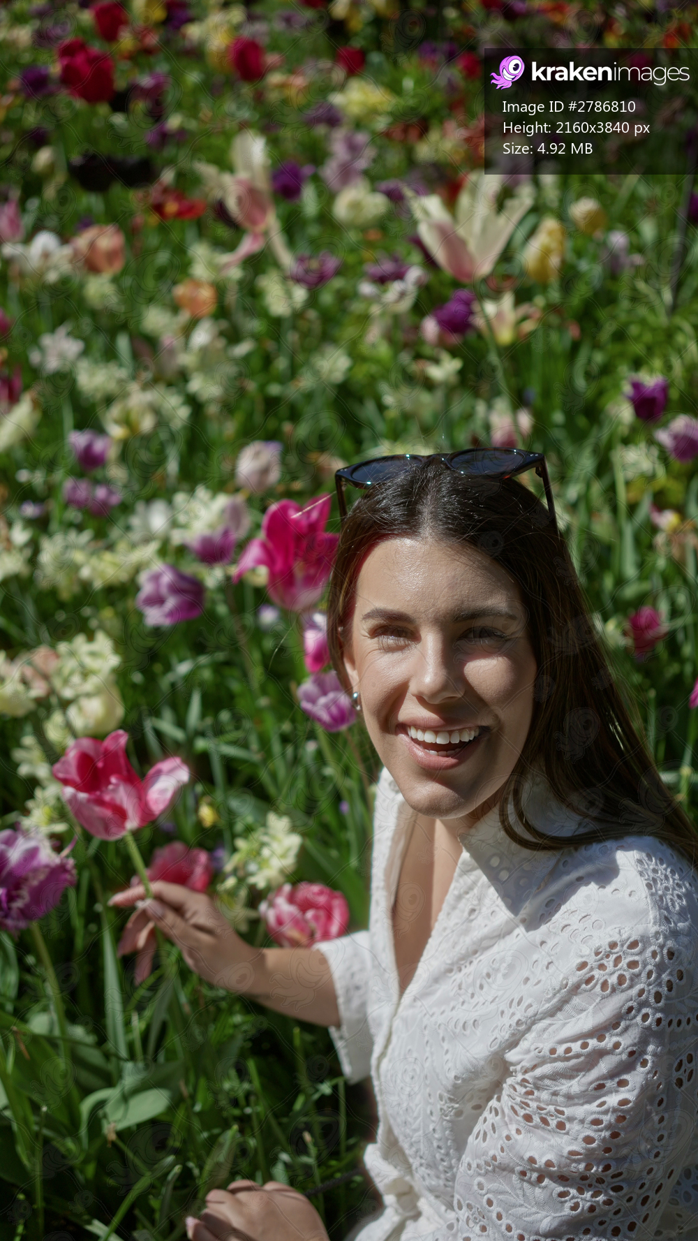 Woman with brunette hair enjoying tulips in a colorful garden in lisse, netherlands on a sunny day, wearing a white dress and surrounded by vibrant spring flowers. - Kraken Images