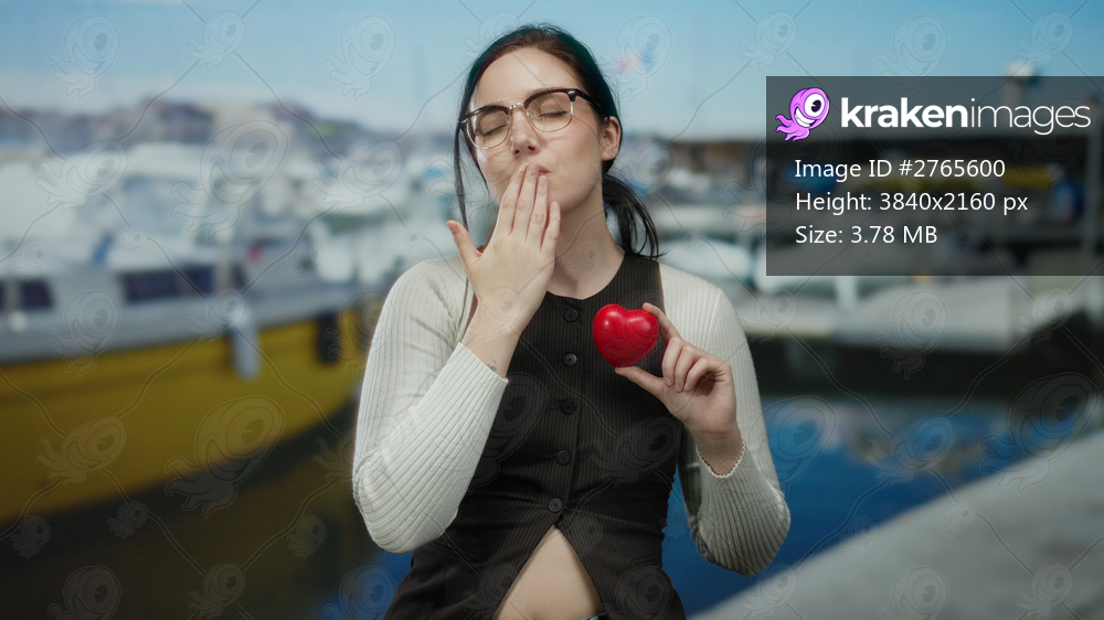 Woman with brunette hair and glasses holding a red heart sends a kiss near boats at a sunny port backdrop.