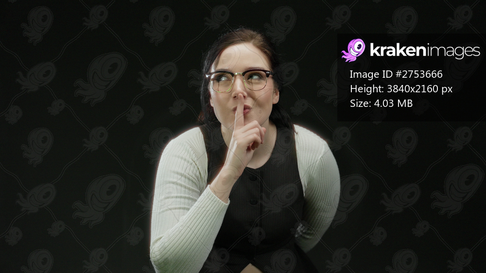 Woman with brunette hair and glasses making a shushing gesture against a black background, expressing secrecy and silence