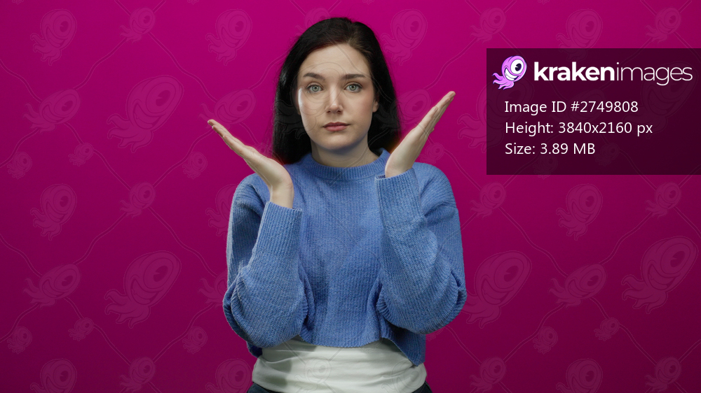 Woman with brunette hair in blue sweater against pink background expressing uncertainty with a shrugging gesture.