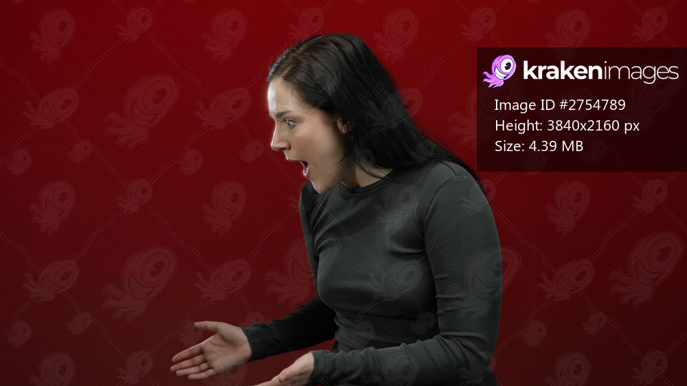 Woman with brunette hair in casual outfit smiling against bold red background with dynamic gestures suggesting surprise and excitement.