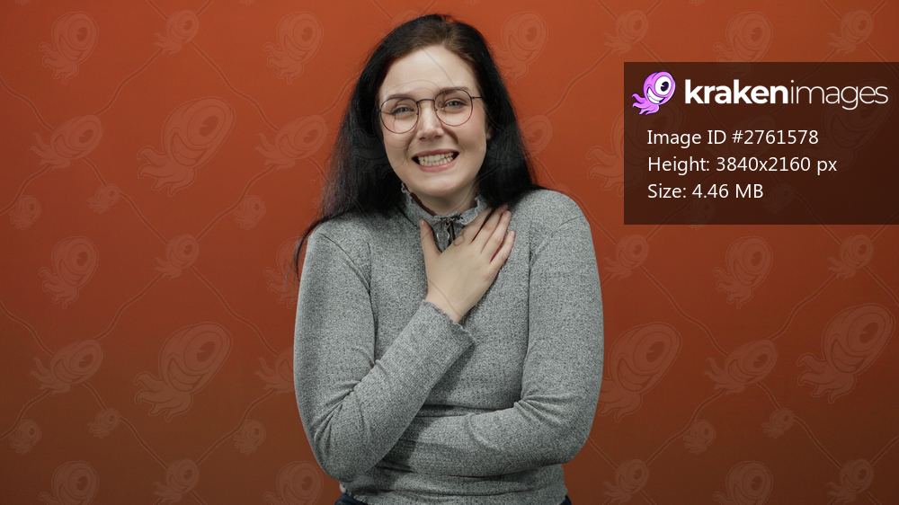 Woman with brunette hair in glasses and casual sweater expresses emotion against red background, placing hand on chest, conveying feelings of discomfort and surprise. - Kraken Images