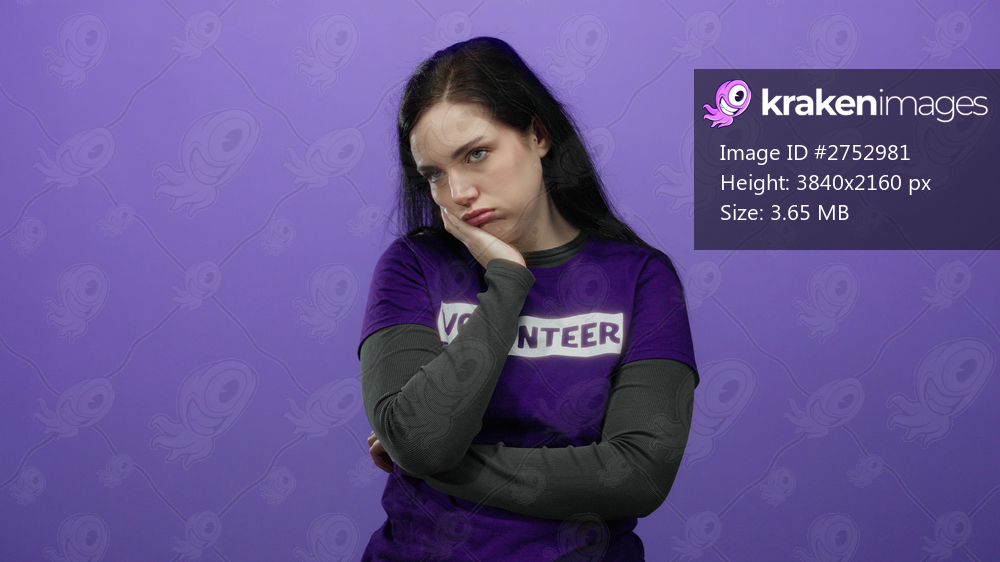 Woman with brunette hair in purple volunteer shirt against purple background appears tired and thoughtful.