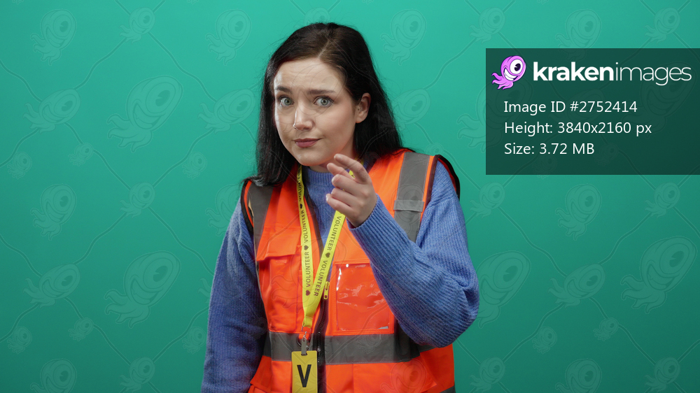 Woman with brunette hair in volunteer vest making loser gesture against a green background demonstrating playful expression.