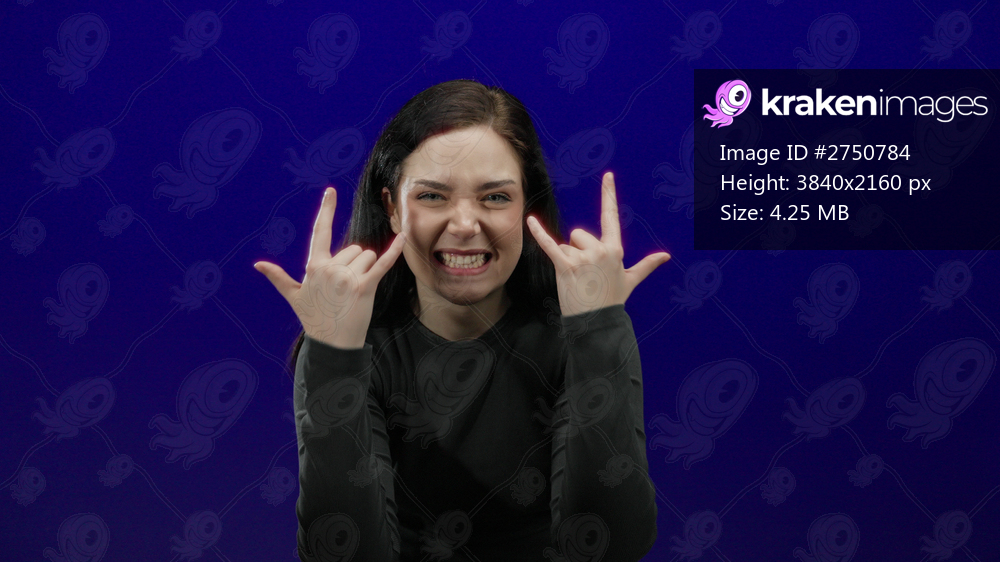 Woman with brunette hair joyfully makes rock gesture against blue background wearing black shirt.