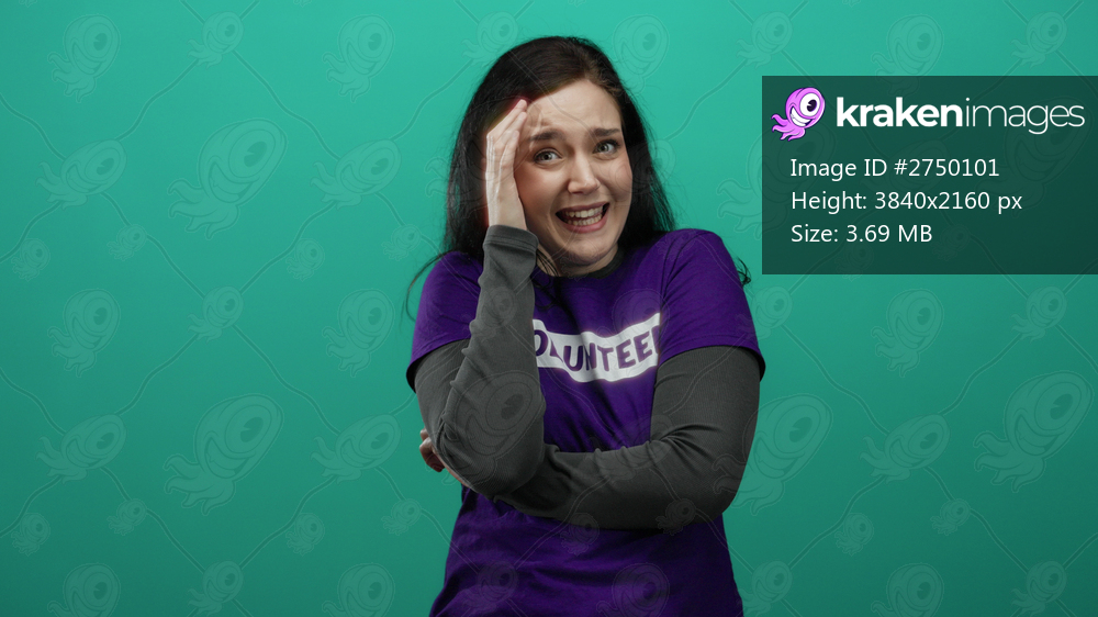 Woman with brunette hair laughing joyfully in volunteer shirt against green background signifying excitement and service dedication
