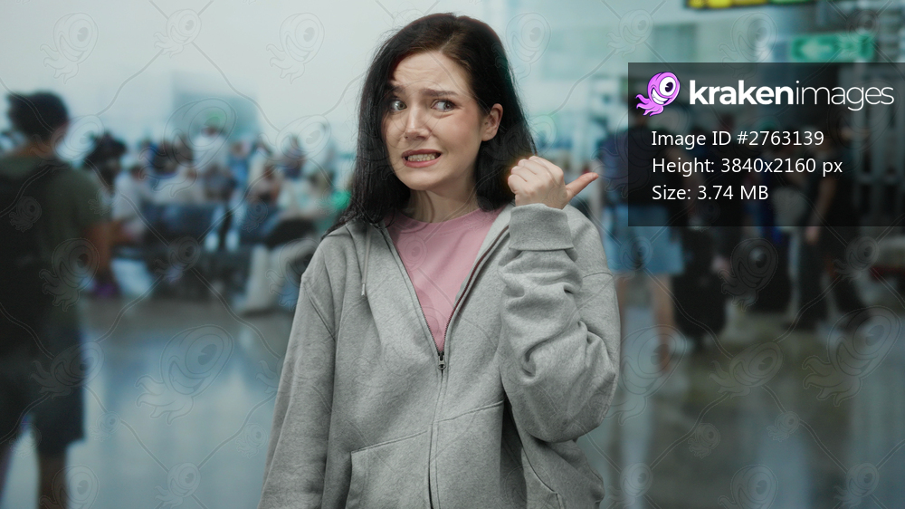 Woman with brunette hair looking confused while pointing with her thumb in busy airport terminal