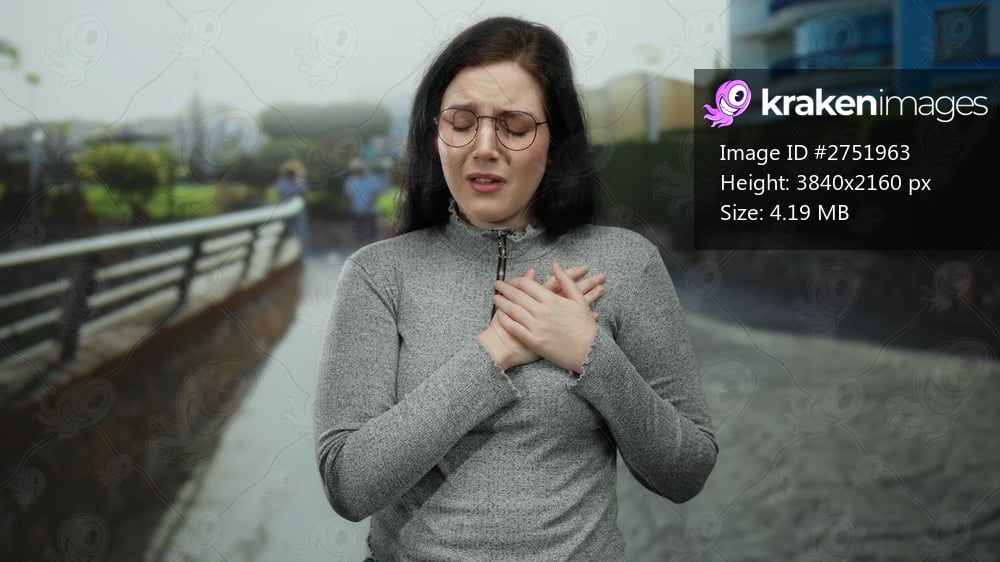 Woman with brunette hair looking emotional on a seaside promenade, capturing deep feelings with beautiful sea background and casual clothing.