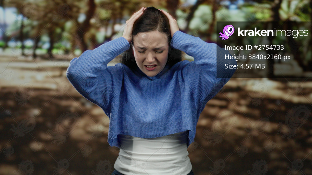 Woman with brunette hair looking worried wears blue sweater in green outdoor park setting surrounded by trees and sunlight creating a serene yet tense atmosphere. - Kraken Images
