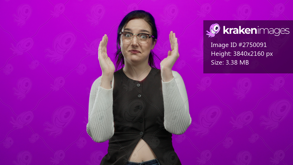 Woman with brunette hair makes size gesture against vibrant pink background demonstrating expressive emotion and creativity in a visually striking composition with glasses and sweater. - Kraken Images