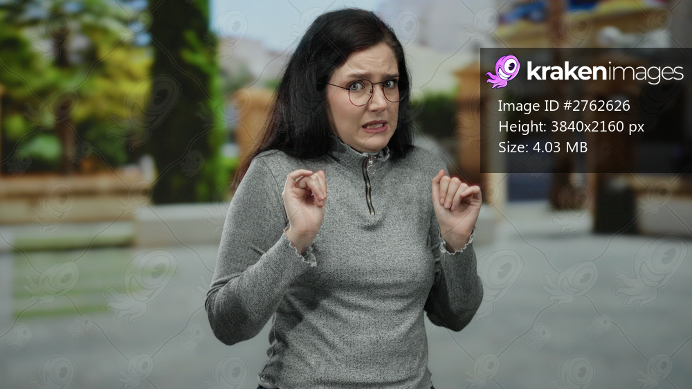 Woman with brunette hair stands on an outdoor street wearing glasses and a gray sweater, portraying an uncertain expression with trees and urban background. - Kraken Images