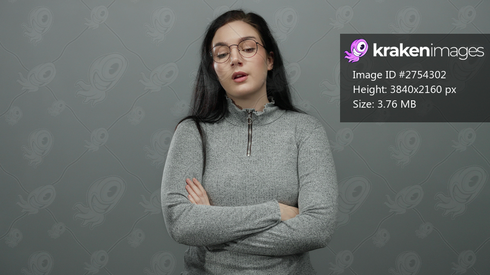 Woman with brunette hair wearing glasses and a grey sweater stands against a grey background with an expressive pose and crossed arms conveying confidence and curiosity. - Kraken Images