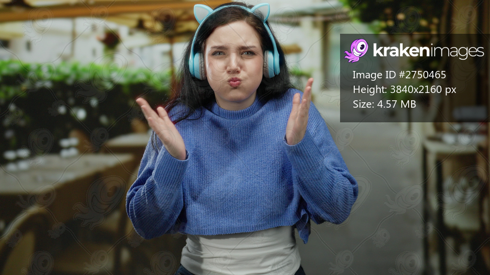 Woman with brunette hair wearing headphones expresses surprise on a restaurant terrace, surrounded by urban scenery, creating a lively and modern street atmosphere. - Kraken Images