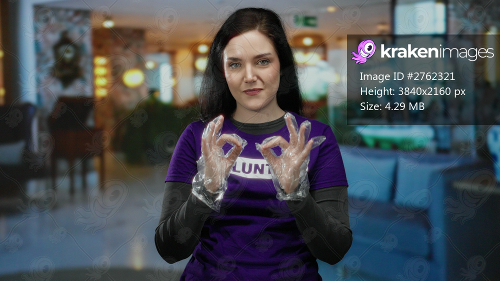 Woman with brunette hair wearing volunteer t-shirt stands in hotel lobby making ok gesture with gloved hands, conveying positivity and readiness to help in community activities. - Kraken Images