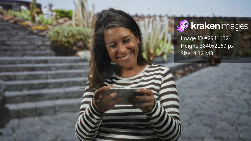 Woman brunette holding smartphone in hand, raising other hand and looking up while smiling on stone street steps; joy celebration connection.