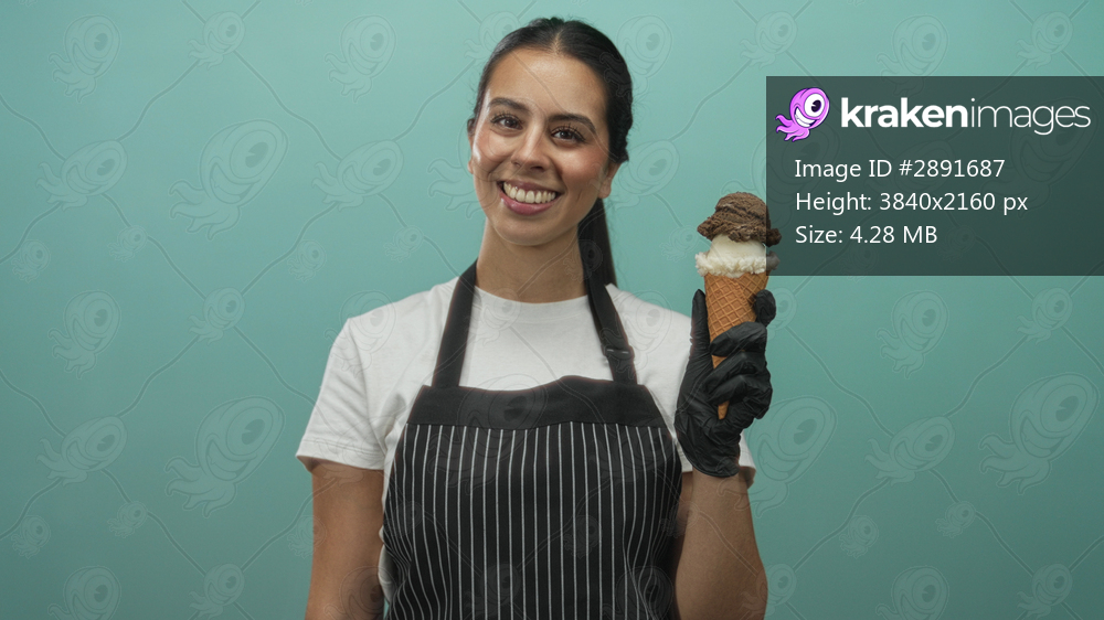 Woman brunette in apron holding an ice cream cone in a gloved hand and smiling at it in a studio with turquoise backdrop; sweet joy.