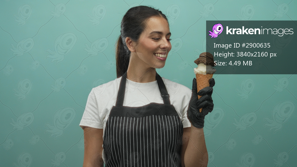 Woman brunette in apron holding an ice cream cone in a gloved hand and smiling at it in a studio with turquoise backdrop; sweet joy.