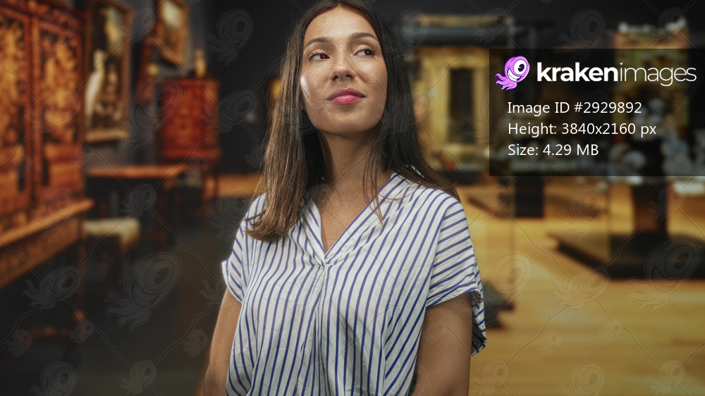 Woman brunette in striped shirt looks to side at painting with face visible in museum building; contemplation art appreciation.
