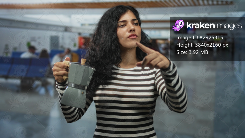 Woman brunette pointing with finger while holding a moka pot and gesturing forward in busy airport terminal; travel routine determination.