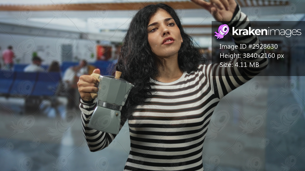 Woman brunette pointing with finger while holding a moka pot and gesturing forward in busy airport terminal; travel routine determination.