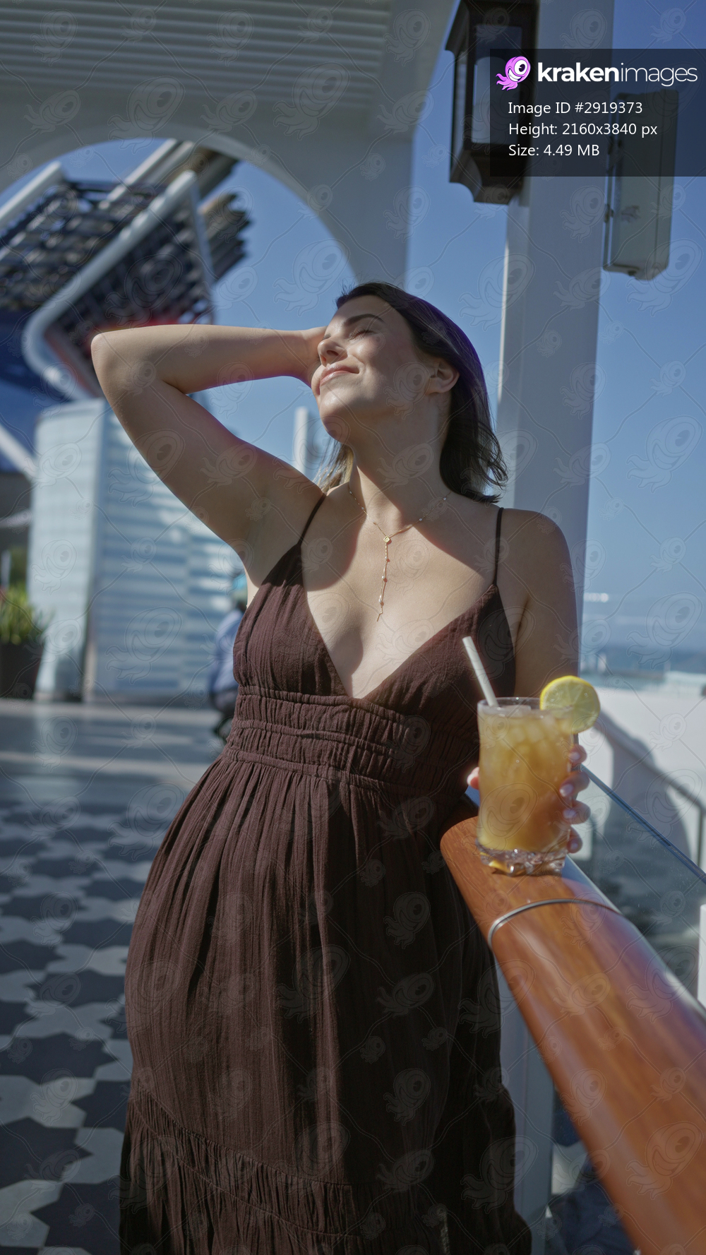 Woman brunette smiles and touches hair while holding iced tea with lemon at cruise terrace railing, visible cleavage and sunlit deck; sunny relaxation.
