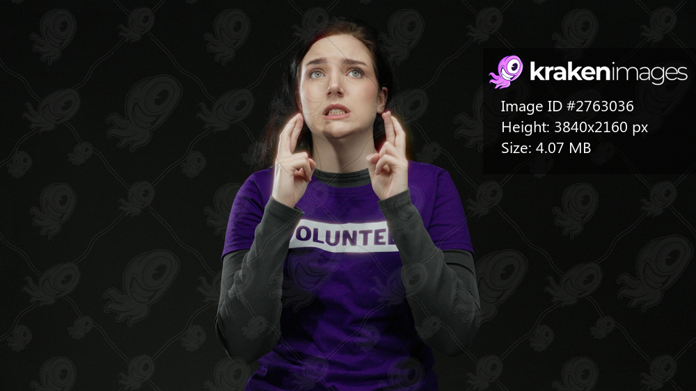 Woman brunette volunteer crossing fingers hoping with a pensive expression against a black background.