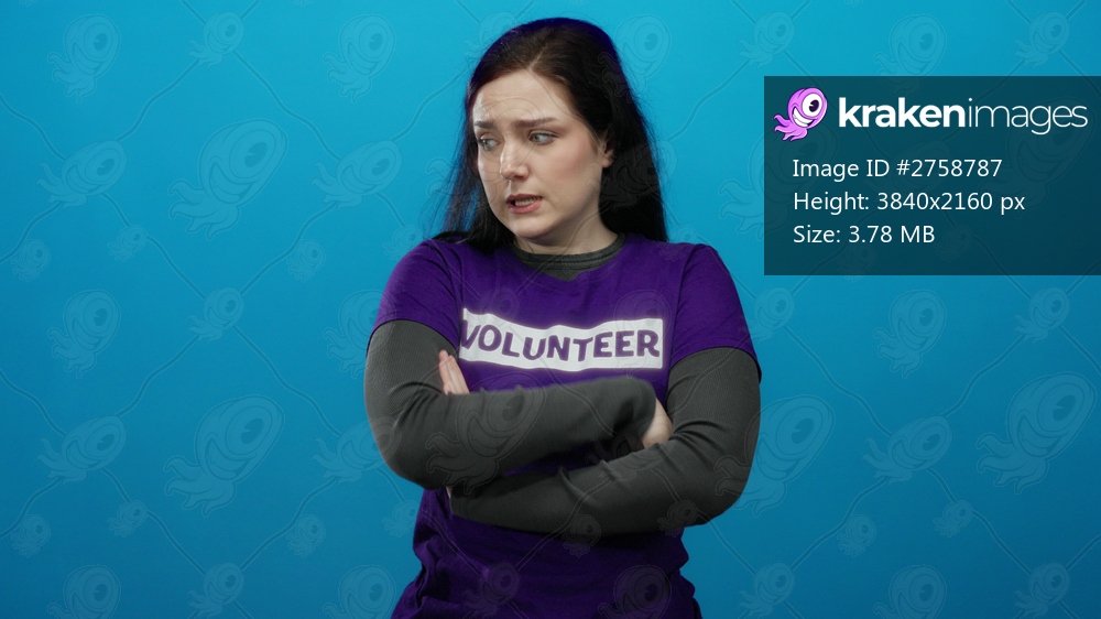 Woman brunette volunteer looking pensive against blue background wearing purple shirt in studio setting depicting thoughtful expression diversity in humanity emotion communication. - Kraken Images