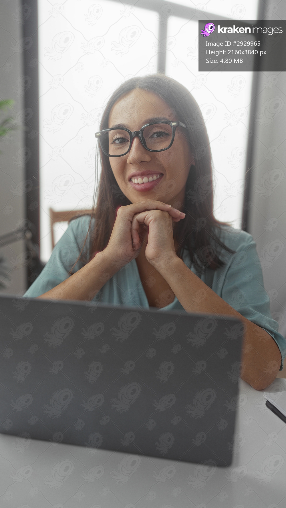 Woman brunette wearing glasses with hands clasped under chin at studio desk with laptop visible; professional confidence.