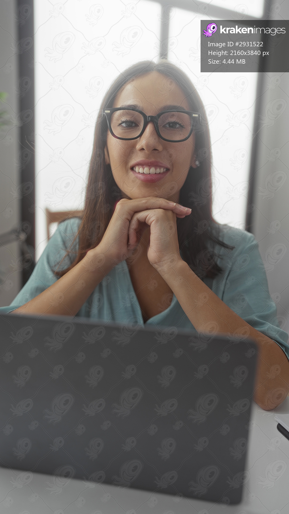 Woman brunette wearing glasses with hands clasped under chin at studio desk with laptop visible; professional confidence.