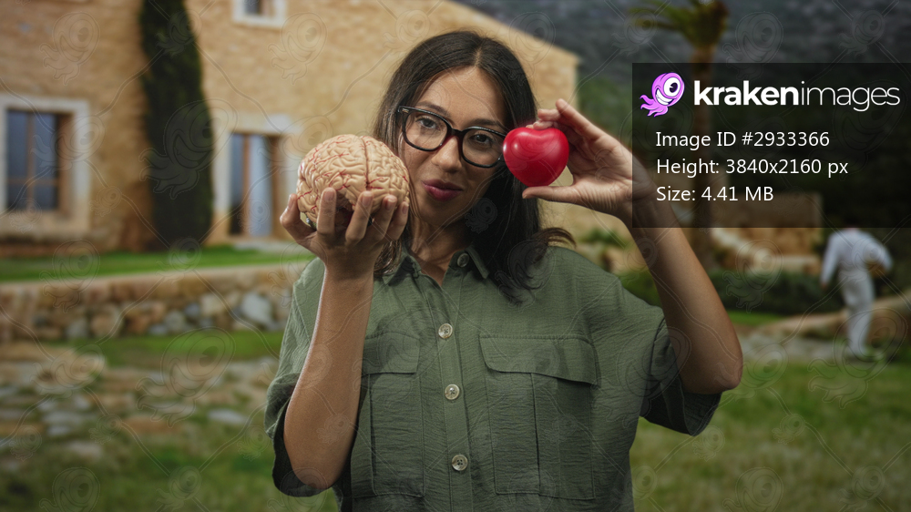 Woman brunette wearing glasses holding brain model and red heart at building entrance on a stone path outdoors; contemplation.