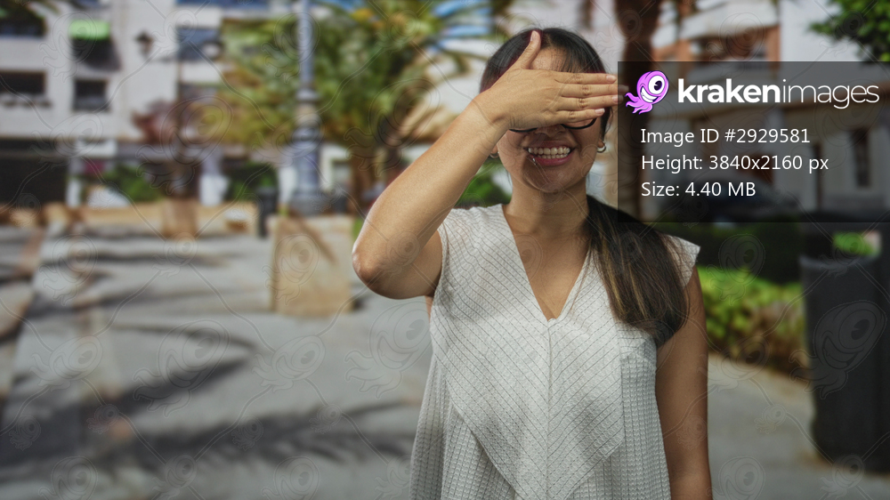 Woman brunette wearing glasses and white sleeveless top with hand to forehead on street by palm tree and building; casual confidence.