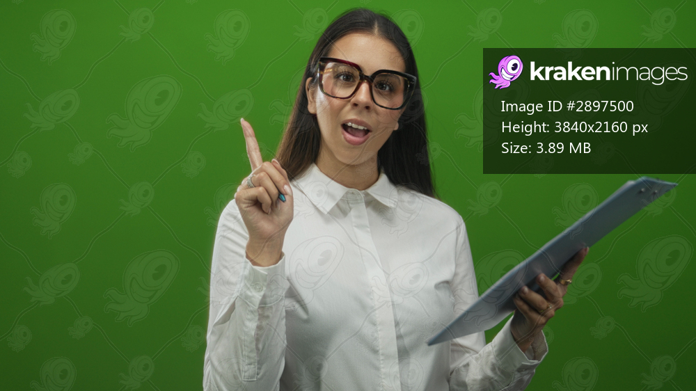 Woman brunette wearing large glasses writing on clipboard in green studio while pointing finger to clipboard; confident concentration.