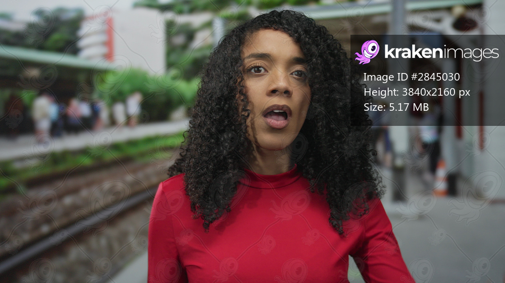 Woman brushes curly hair with hand beside railway tracks at station while commuters stand behind her; confidence.