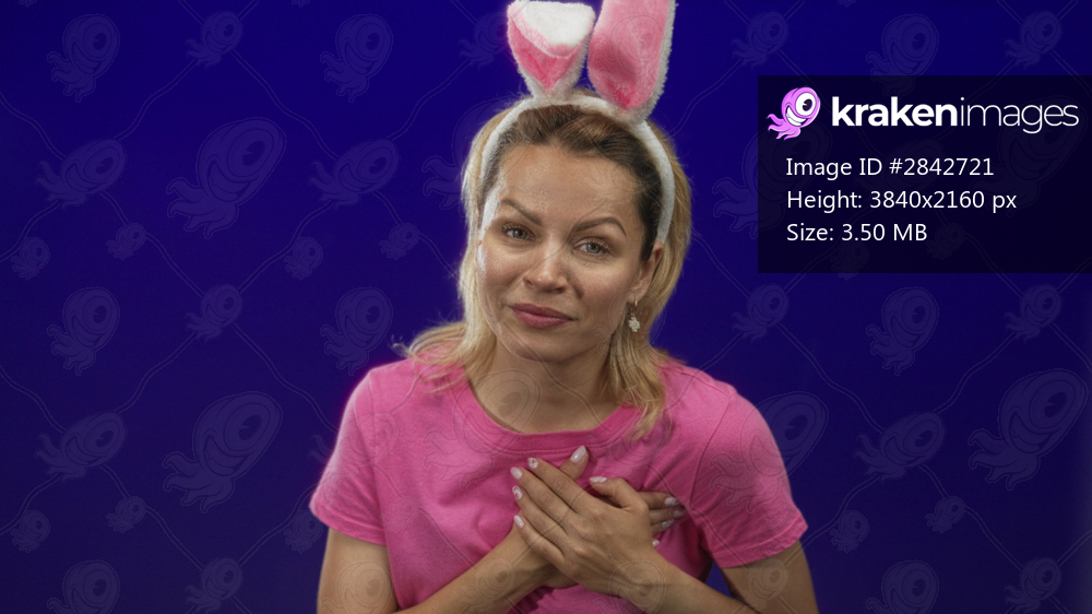 Woman with bunny ears and blonde hair clutching chest and wearing pink shirt in studio against purple backdrop; pain.