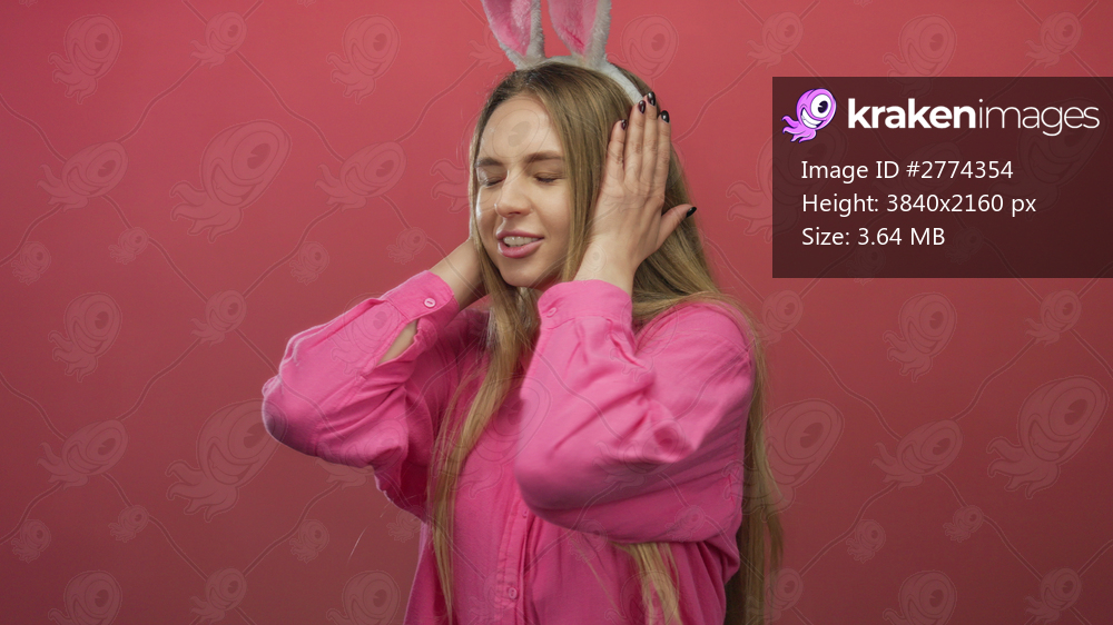 Woman with bunny ears covers her ears against a vibrant red background, expressing frustration while wearing a bright pink shirt, showcasing playful holiday spirit and seasonal cheer. - Kraken Images