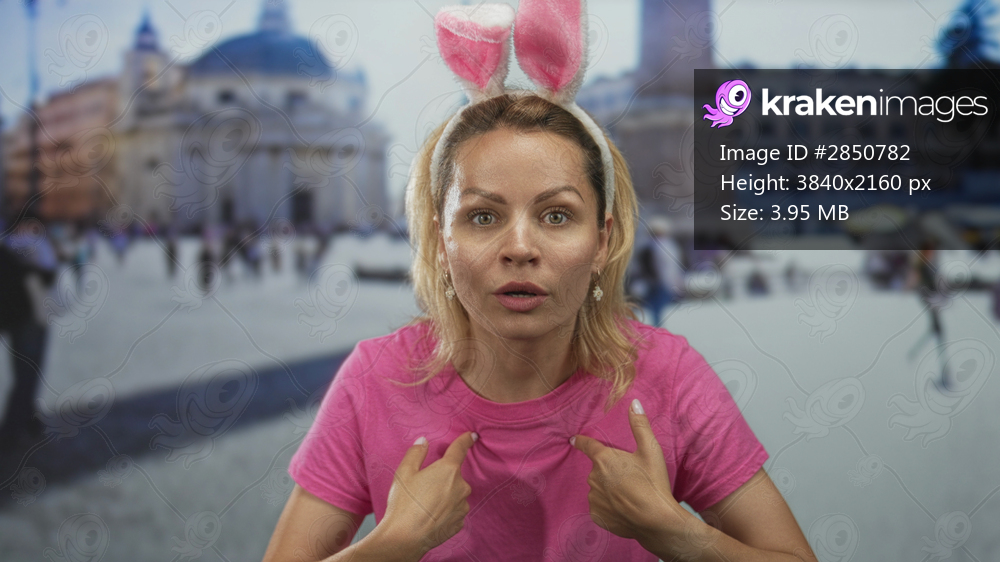 Woman with bunny ears headband points finger to chest on busy urban street with shocked expression; confusion.