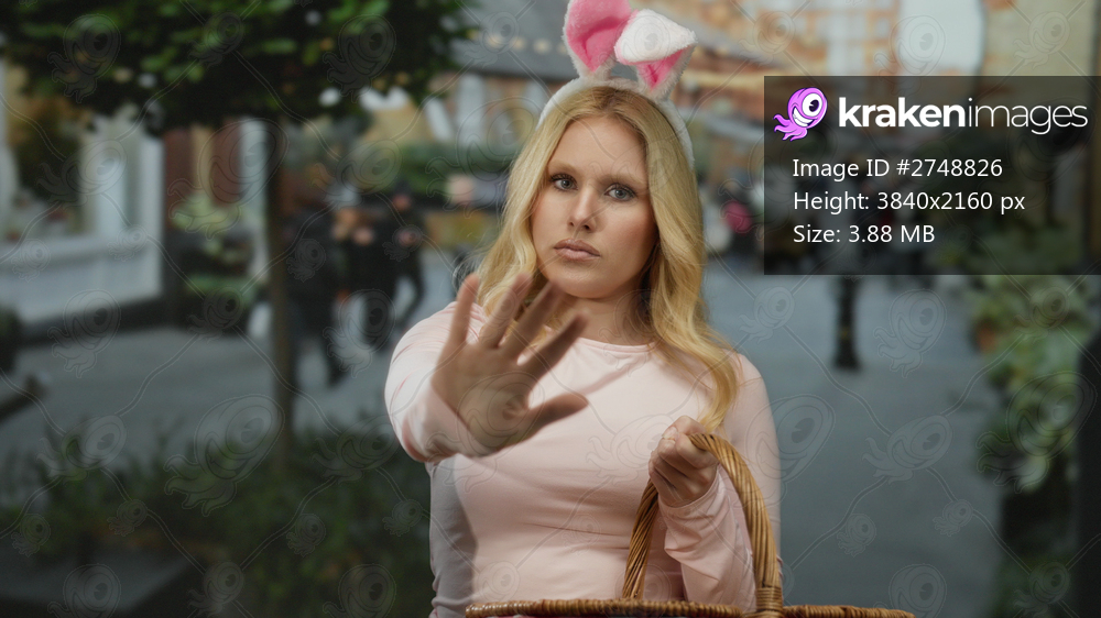 Woman with bunny ears humorously gesturing stop while holding a basket on a busy city street filled with people and shops during the day outdoors.