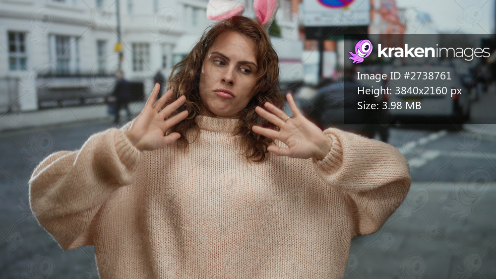 Woman with bunny ears in sweater gestures playfully on a busy city street with cars and buildings in the background.