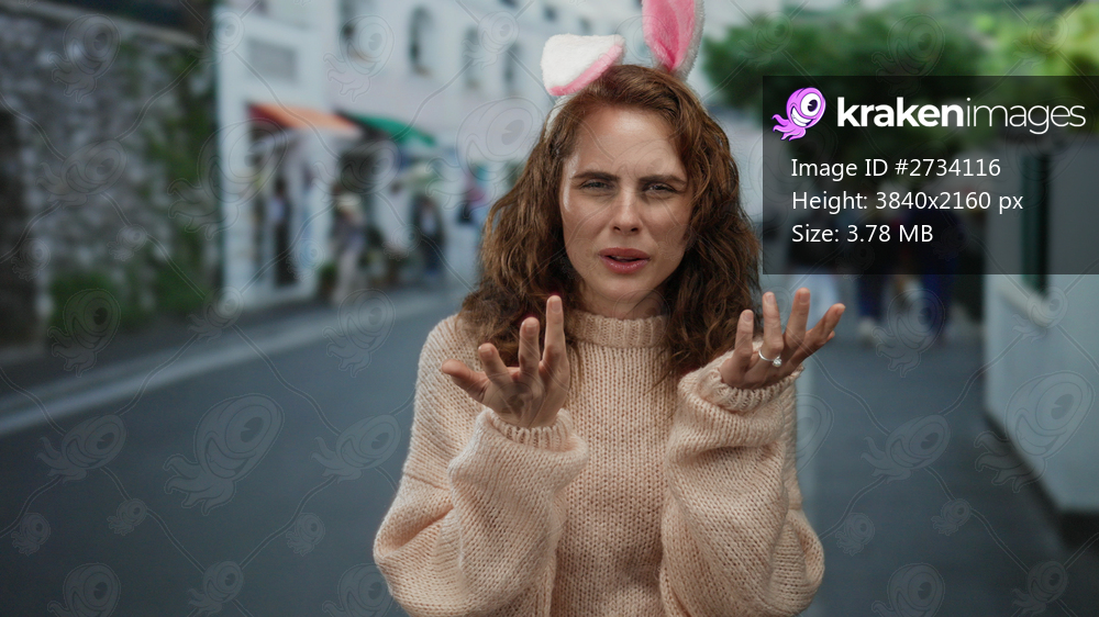 Woman with bunny ears stands amused on a lively city street, wearing a cozy sweater and expressing surprise amidst a blurred background of bustling urban life. - Kraken Images