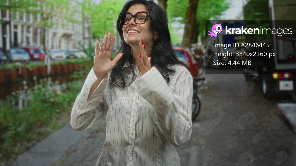 Woman calling with raised hands wearing glasses and white shirt on street beside building facade; longing.