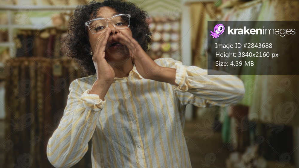 Woman calls out with hands cupped around mouth amid colorful clothing racks in a well lit retail store; enthusiasm.