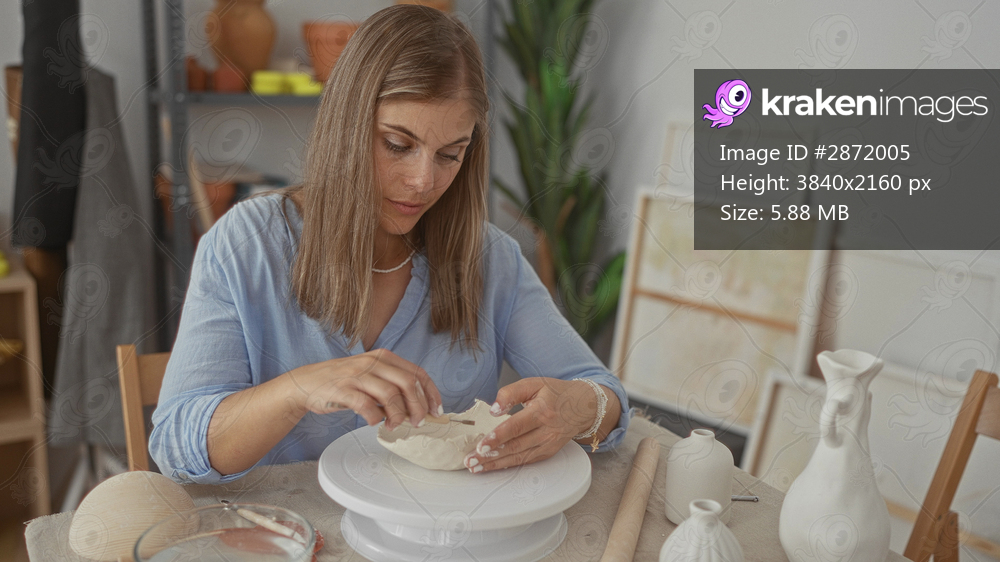 Woman carefully sculpts clay bowl on spinning pottery wheel using bare hands in spacious art studio; deep concentration.