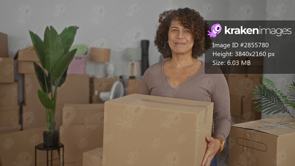 Woman carrying cardboard box inside building of her new home scattered with moving boxes and a potted plant; optimism.