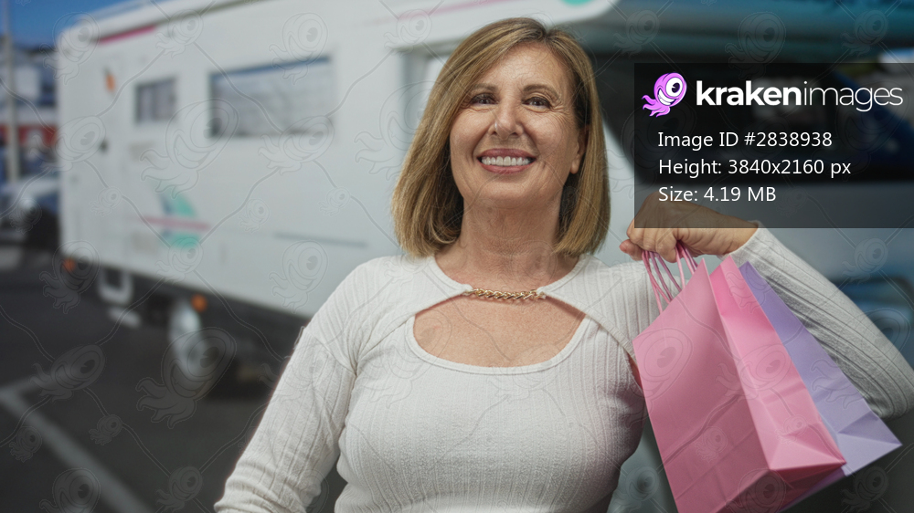 Woman casually holds pink shopping bag and smiles while standing near camper van on city street; happiness.
